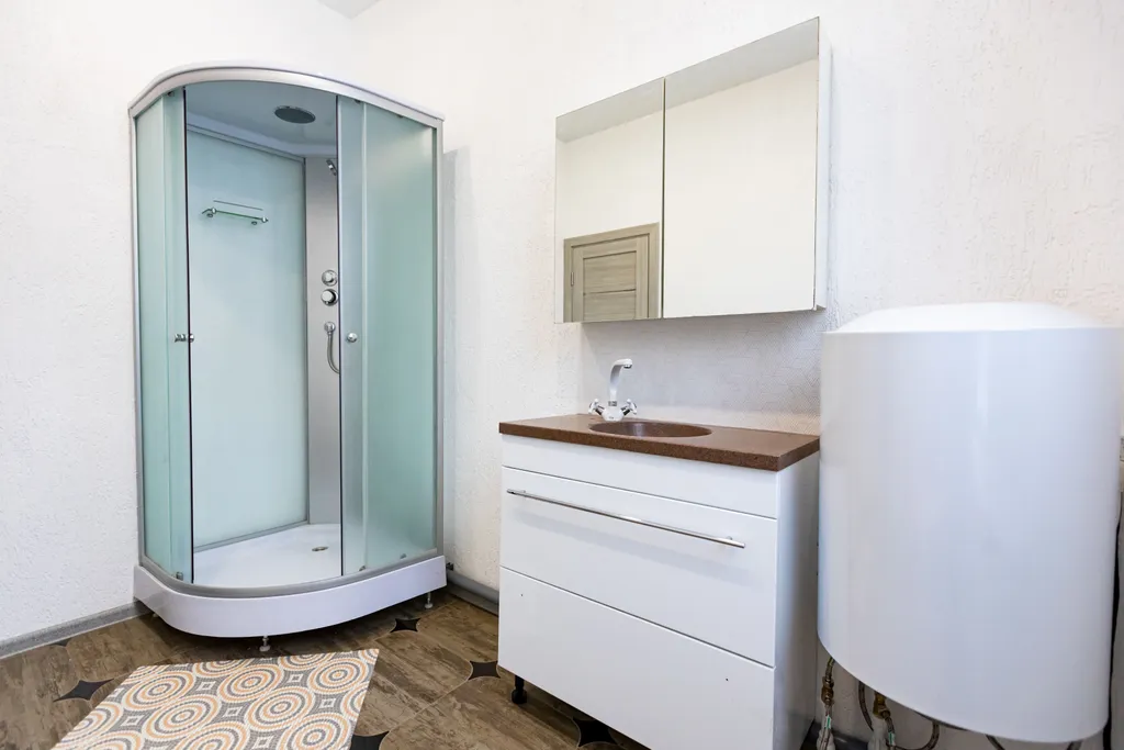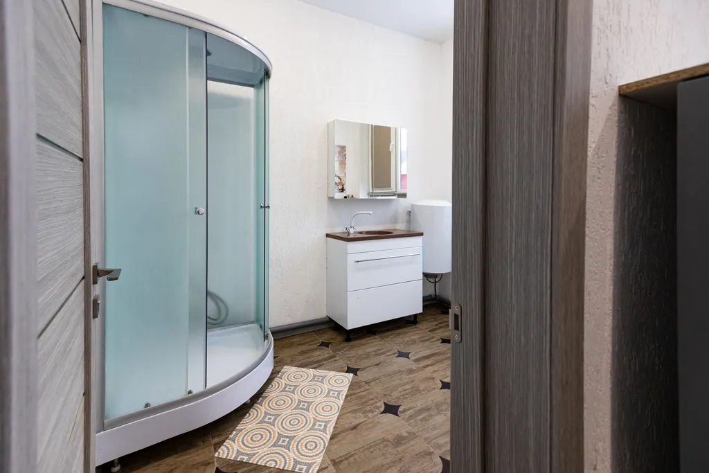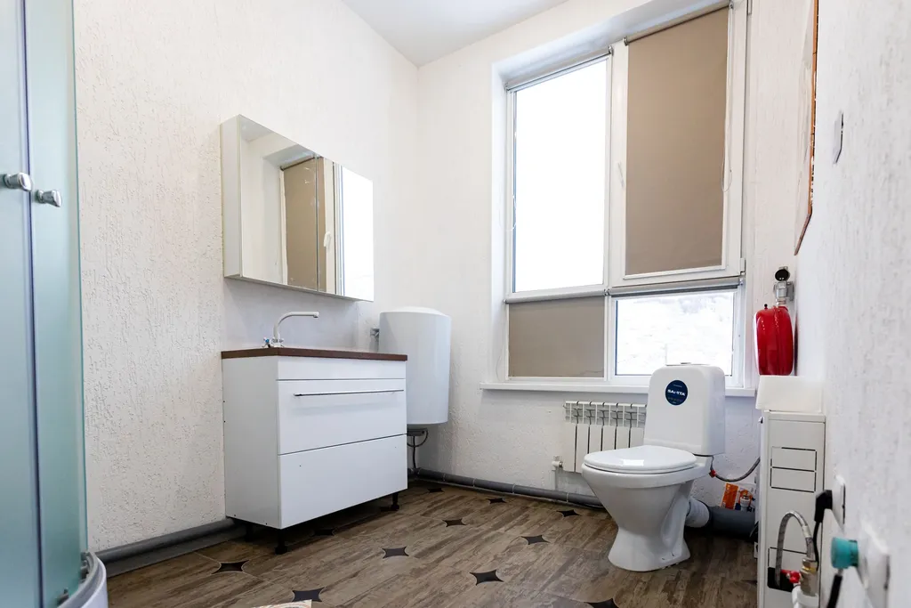 5 санузел: душ, туалет, умывальник, зеркало, вешалка.