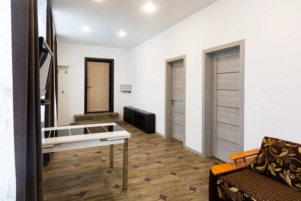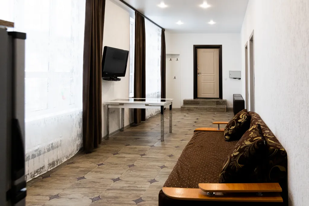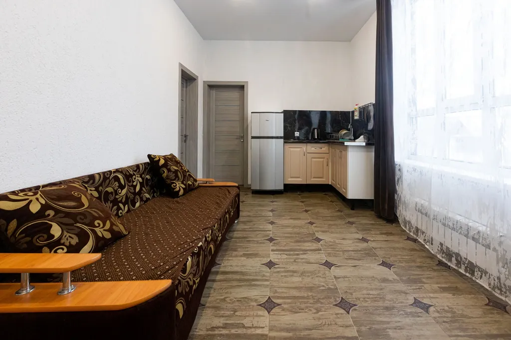 1 гостиная с кухней: раскладной диван, телевизор, большой раскладной стол со стульями, холодильник, микроволновка, эл. Плита, чайник, посуда и прочие нештяки