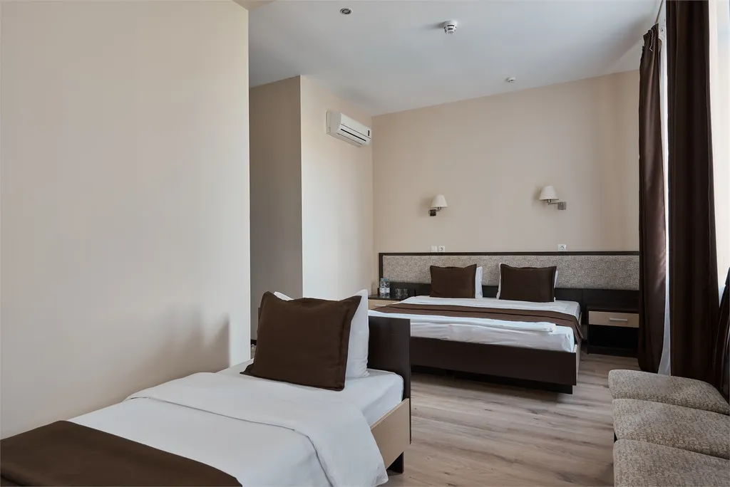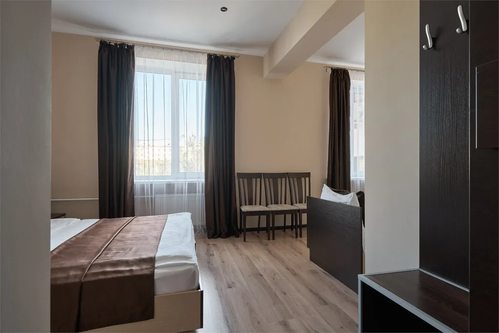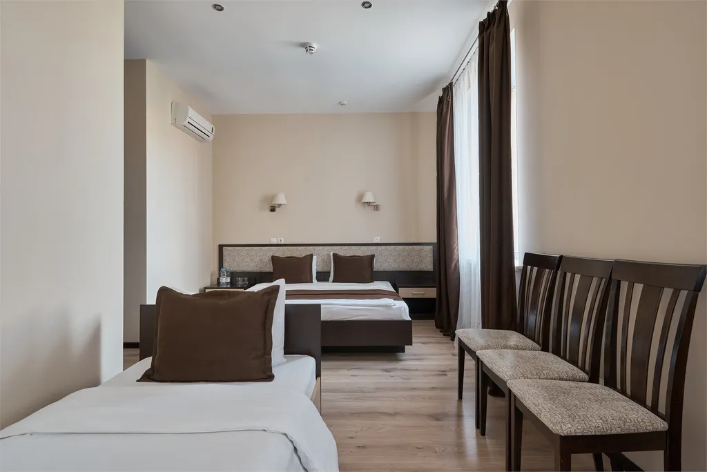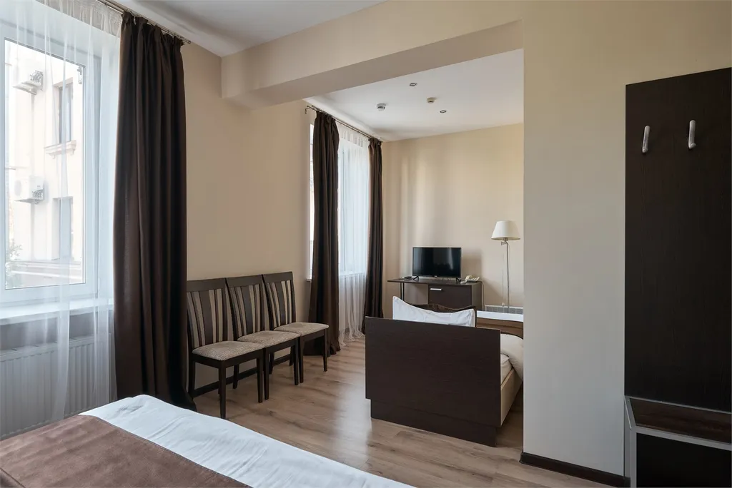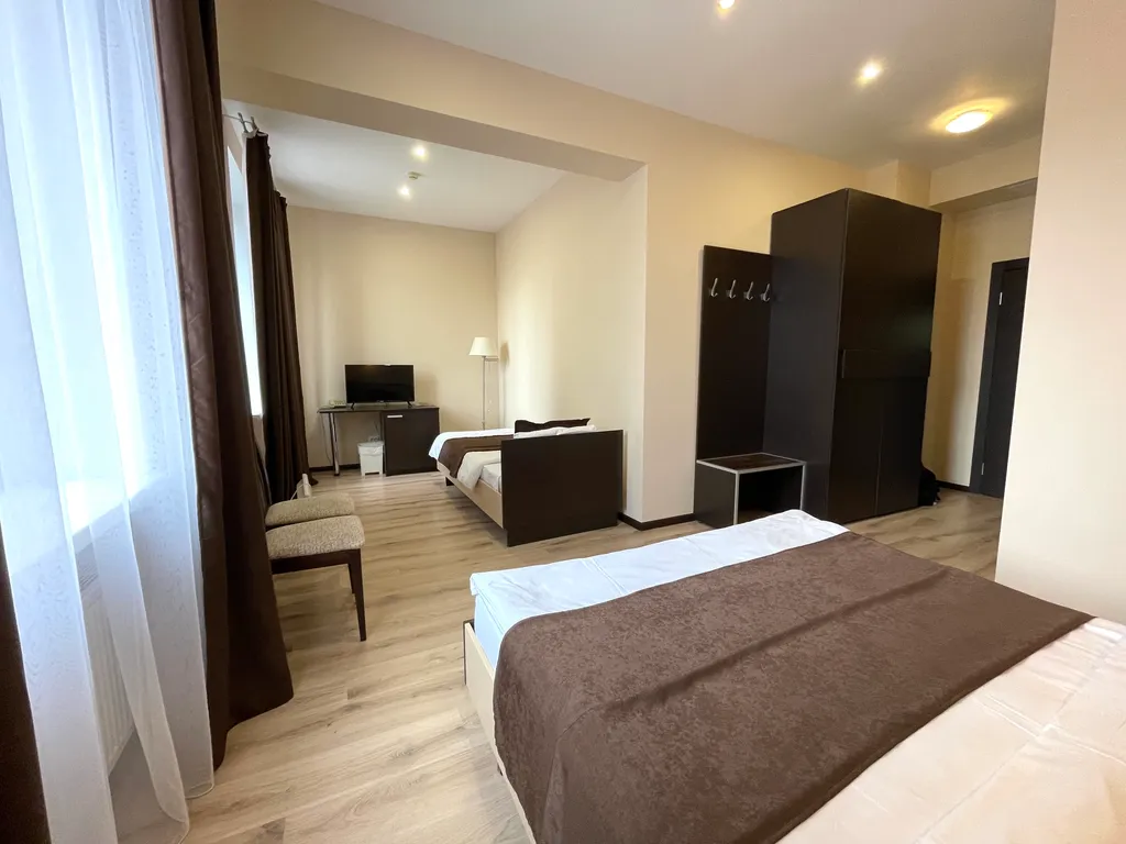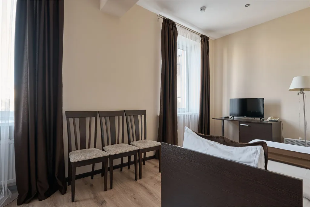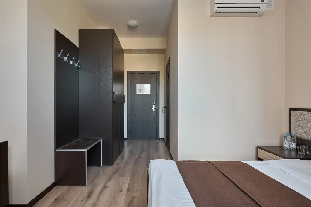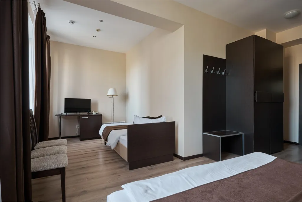 Плазменный телевизор, высокоскоростной wi-fi интернет, шкаф для верхней одежды, кондиционер, холодильник, сейф (бесплатно), письменный стол, душевая кабина, фен, телефон, покрытие – ламинат