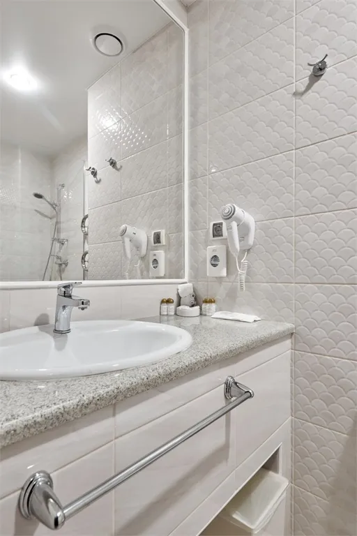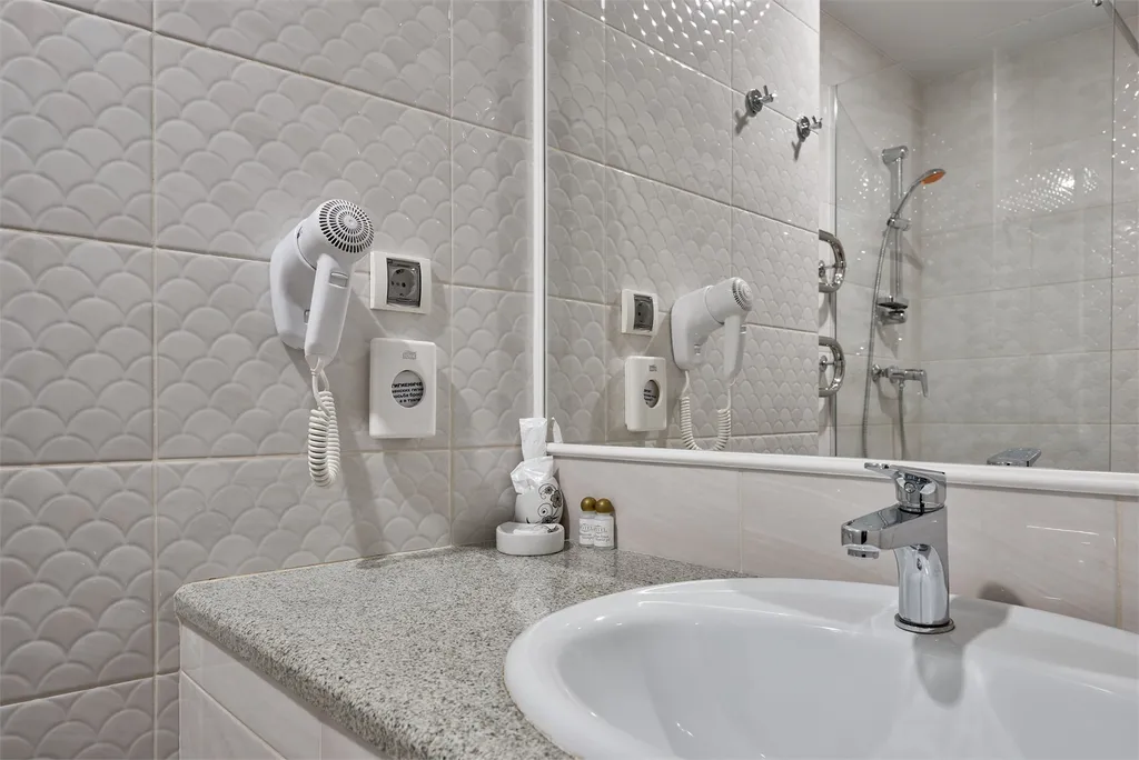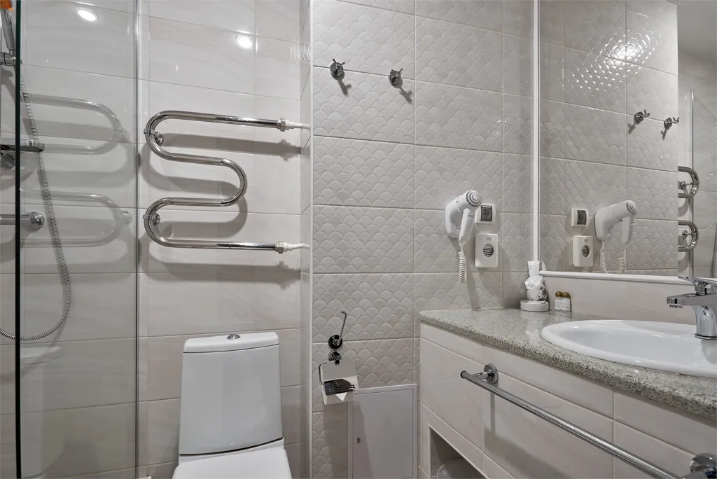 В ванной комнате: душ, комплект полотенец, косметические принадлежности, фен по требованию гостя.
